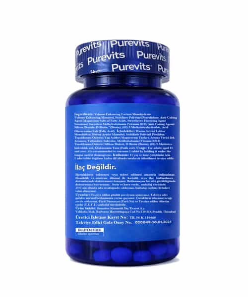 • Purevits B12 Complex Methylcobalamin; B12 vitamini, folik asit ve biotin içeren bir takviye edici gıdadır.
